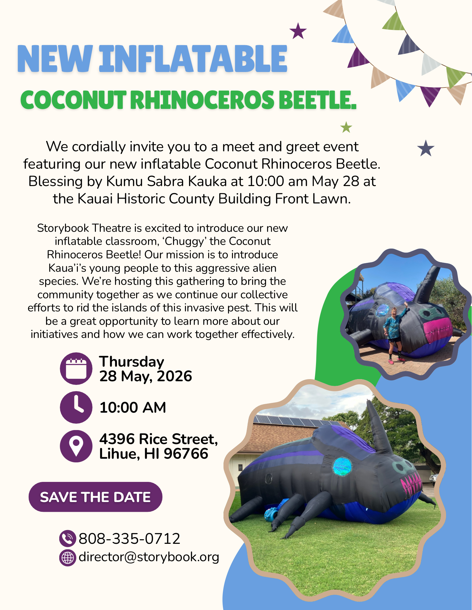 Blessing by Kumu Sabra Kauka 10:00 am, May 28 Kauai Historic County Building Front Lawn Storybook Theatre is excited to introduce our new inflatable classroom, “Chuggy” the Coconut Rhinoceros Beetle! Our mission is to introduce Kaua’i’s young people to this aggressive alien species. We are hosting this gathering to bring the community together as we continue our collective efforts to eradicate this invasive pest. This will be an excellent opportunity to learn more about our initiatives and how we can collaborate effectively.